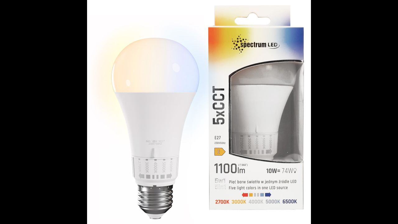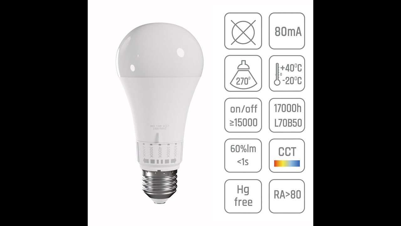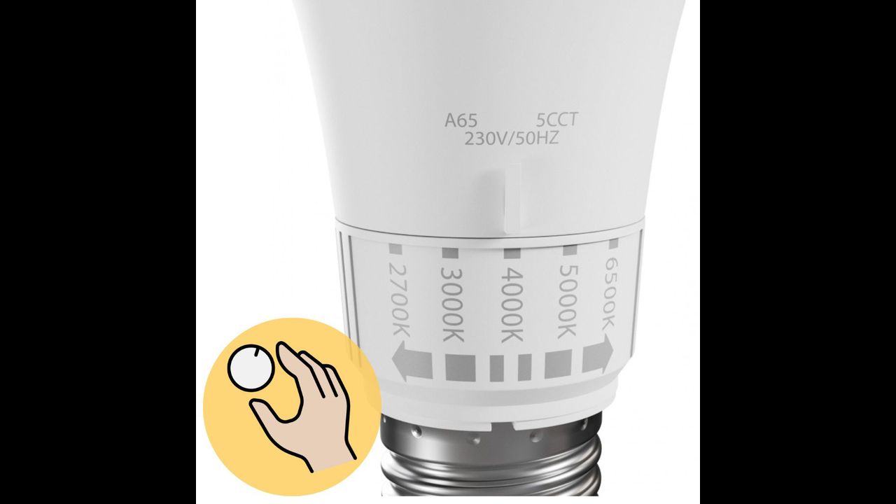 La moderna bombilla LED GLS de forma clásica combina comodidad y eficiencia energética con funcionalidad adaptada a tus necesidades. Equipada con ajuste de temperatura de color (CCT) entre 2700K / 3000K / 4000K / 5000K / 6500K, permite cambiar rápidamente la iluminación – desde una luz cálida y acogedora hasta una luz fría y brillante para trabajar o estudiar. El interruptor de color intuitivo funciona sin aplicaciones ni mandos adicionales, lo que hace su uso muy sencillo y práctico.