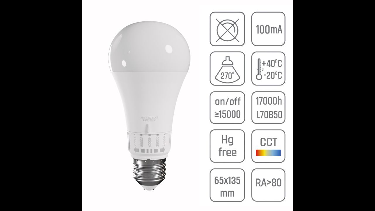 La moderna bombilla LED GLS de forma clásica combina comodidad y eficiencia energética con funcionalidad adaptada a tus necesidades. Equipada con ajuste de temperatura de color (CCT) entre 2700K / 3000K / 4000K / 5000K / 6500K, permite cambiar rápidamente la iluminación – desde una luz cálida y acogedora hasta una luz fría y brillante para trabajar o estudiar. El interruptor de color intuitivo funciona sin aplicaciones ni mandos adicionales, lo que hace su uso muy sencillo y práctico.