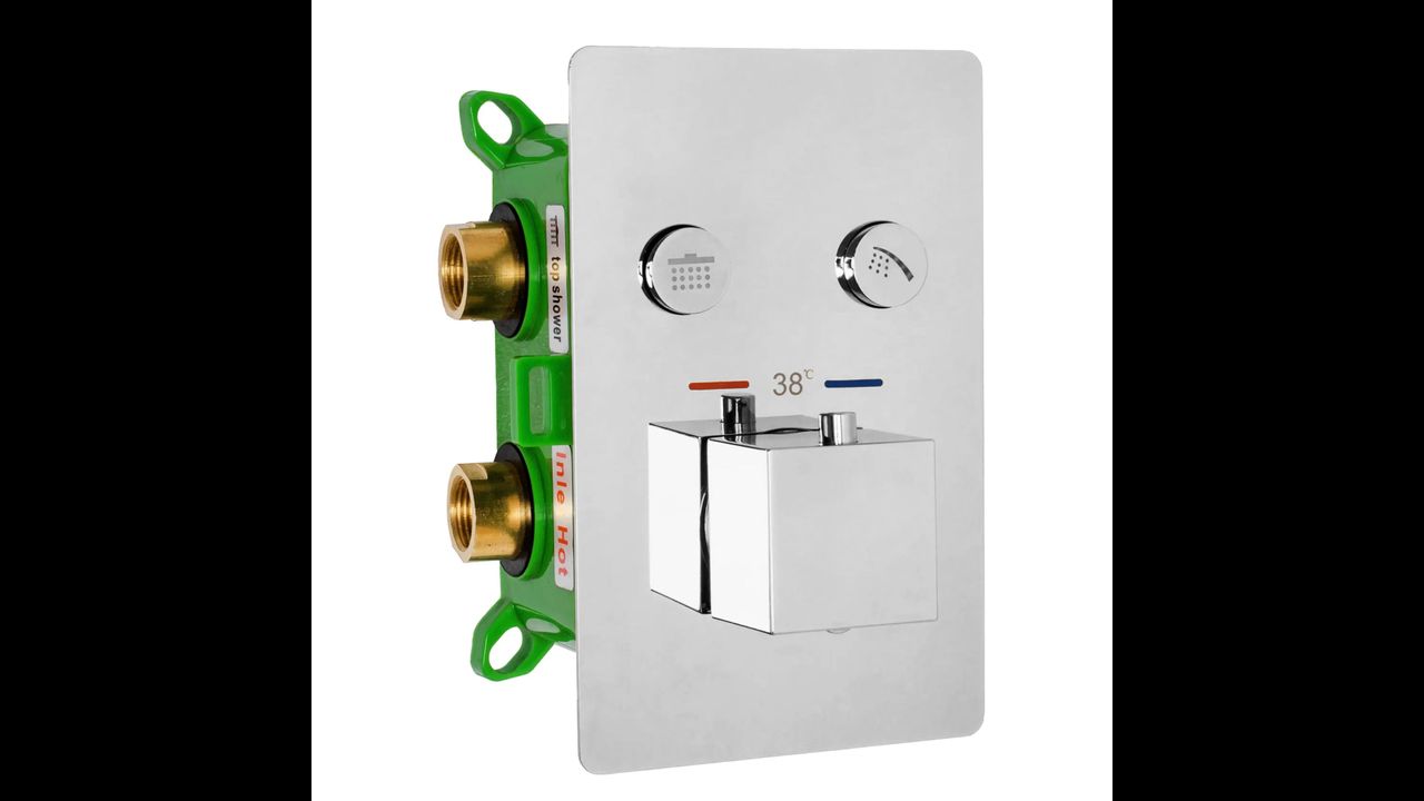 El juego incluye un cabezal de ducha cuadrado y delgado de 30 cm de lado, un mezclador con elementos vistos y ocultos, una manguera con un mango y un juego de puntos.