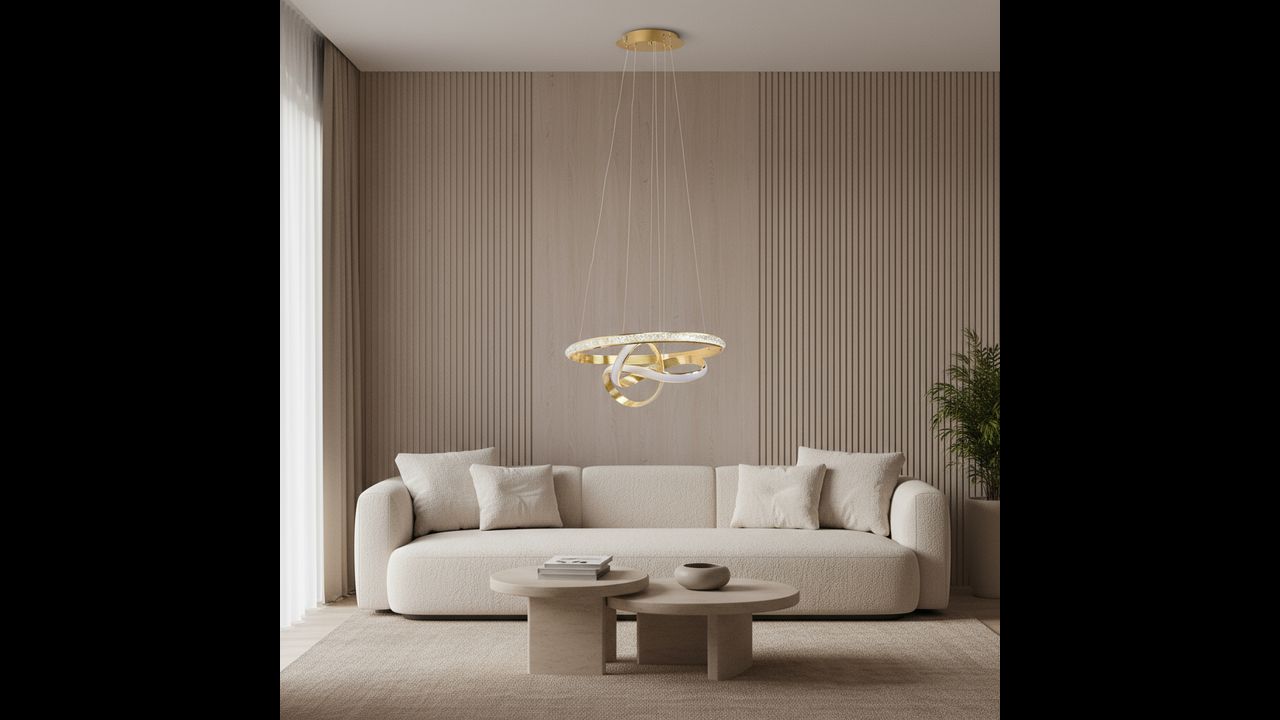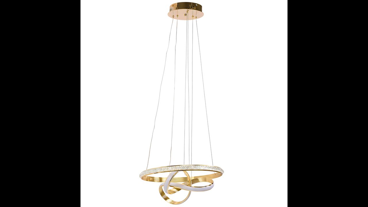 La lámpara colgante moderna con acabado dorado destaca por su forma escultórica y su excepcional ligereza visual. El aro circular con un detalle decorativo de estilo cristalino refleja la luz de manera sutil, mientras que los elementos entrelazados crean una composición tridimensional que atrae las miradas incluso cuando la lámpara está apagada. El módulo LED integrado proporciona una luz uniforme y agradable, aportando al espacio un ambiente elegante y sofisticado.
